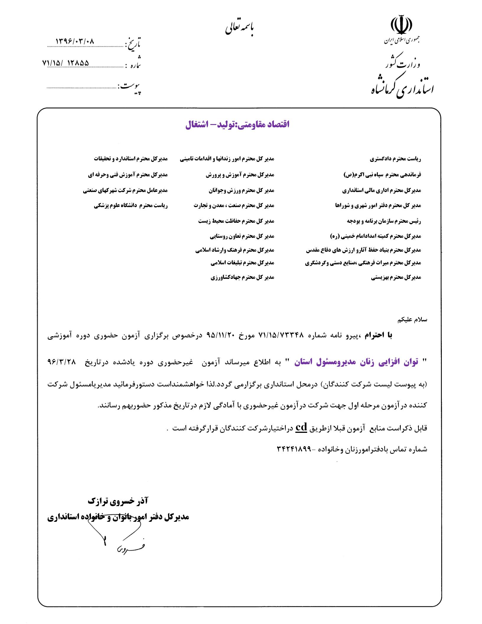 برگزاری آزمون غیر حضوری دوره آموزشی توان افزایی و ارتقاء شغلی زنان مدیر و مسئول استان