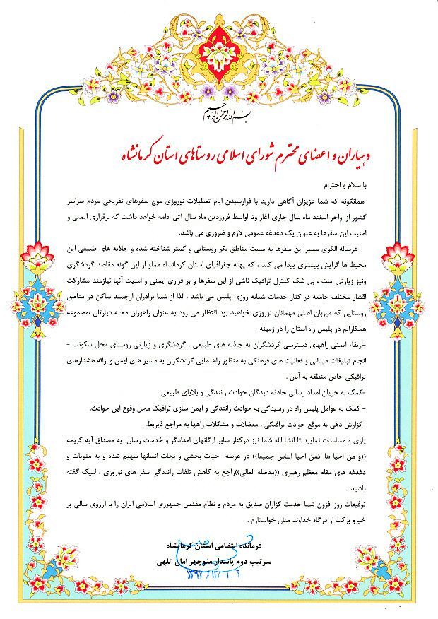 فراخوان فرماندهی انتظامی استان مبنی بر همکاری دهیاران و اعضای شوراهای اسلامی روستاها در راستای کاهش سوانح رانندگی ، کنترل امنیت و فراهم سازی ارائه خدمات مناسب به گردشگران نوروزی