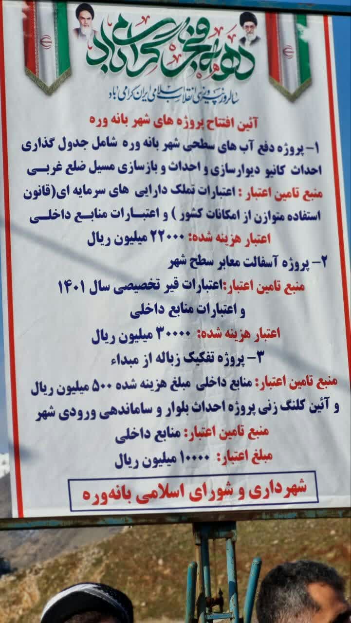 همچنین ۳ پروژه شهرداری بانهوره شامل پروژه دفع آبهای سطحی شهر بانهوره(جدولگذاری، احداث کانیو، دیوارسازی و احداث و بازسازی مسیل ضلع غربی شهر)، پروژه آسفالت معابر سطح شهر و تفکیک زباله از مبداء افتتاح و به بهرهبرداری رسید و کلنگ پروژه احداث بلوار و ساماندهی ورودی شهر بانه وره نیز بر زمین زده شد.